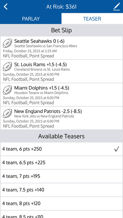 * Multiple betting options (PARLAY, TEASERS, Futures and Prop Bets).